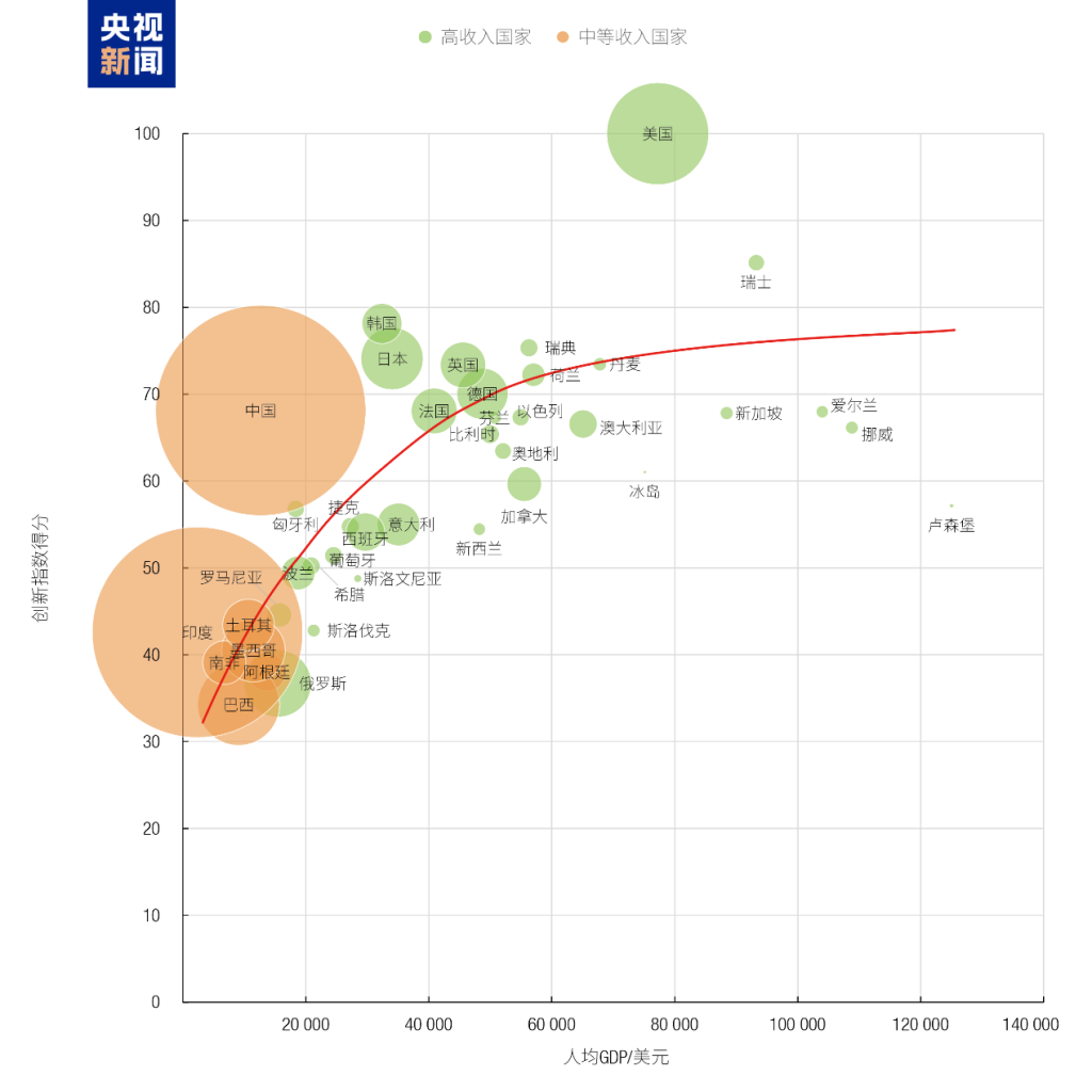 報告によると、世界のイノベーションは、依然として欧米とアジアが主導しており、科学技術のイノベーションが各国の顕著な優位性を示している。中国の総合的なイノベーション能力は、2012年の20位から10位(70.1ポイント)になり、イノベーション資源への投資が継続的に増加しており、知識の産生が傑出しており、企業のイノベーション能力が持続的に向上し、イノベーション環境が徐々に改善されていることから、国の質の高い発展につながっていると評価している。なお、イノベーション能力はアメリカを100とする換算比であり、日本は6位(74.1ポイント)と評価されている。