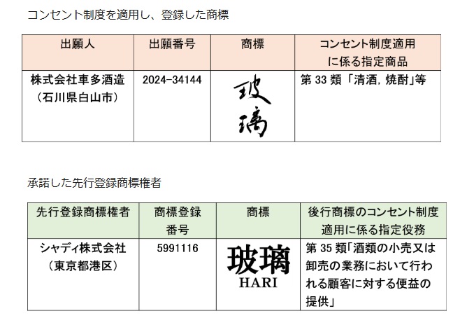 特許庁は、2025年4月7日、経産省サイトで、昨年4月に新たに導入されたコンセント制度を適用した初の商標登録事例を公示した。